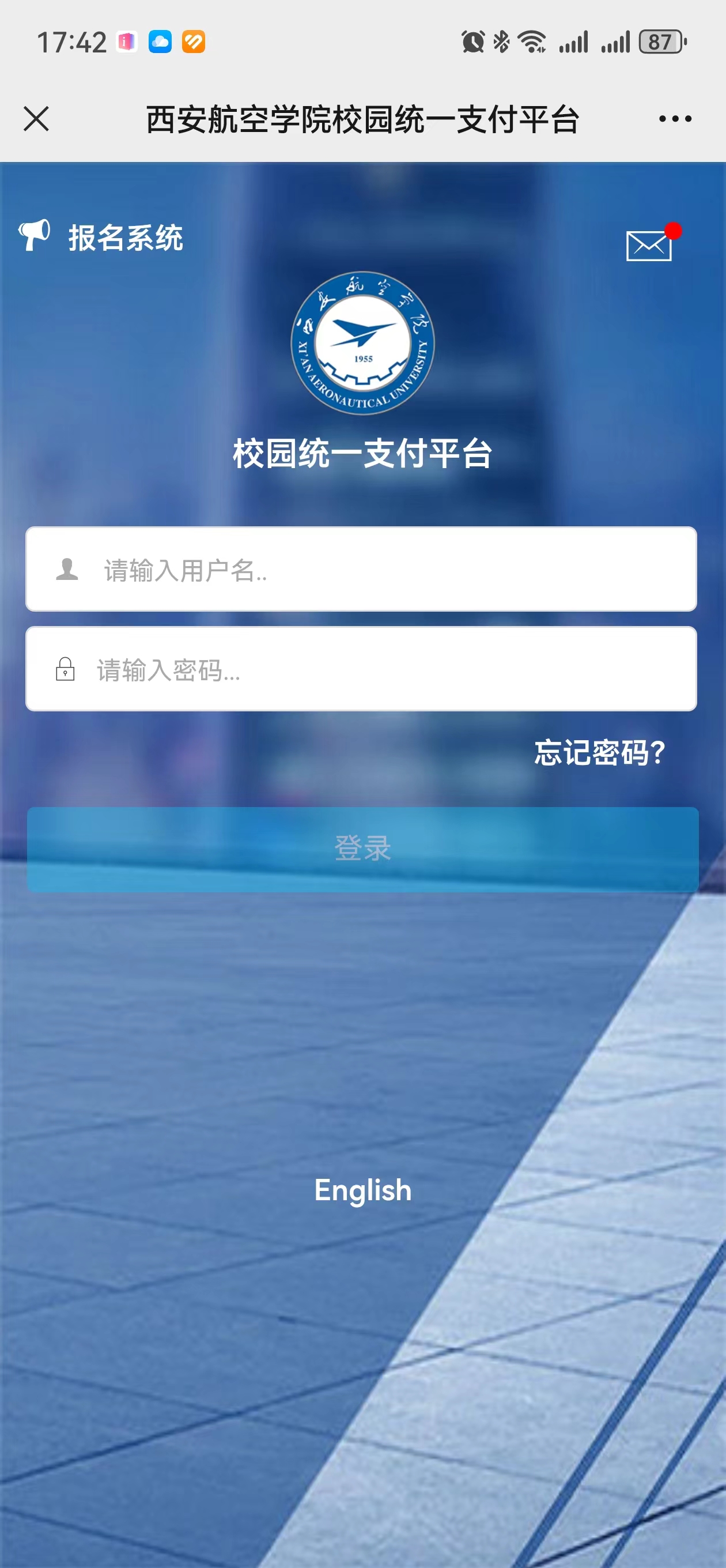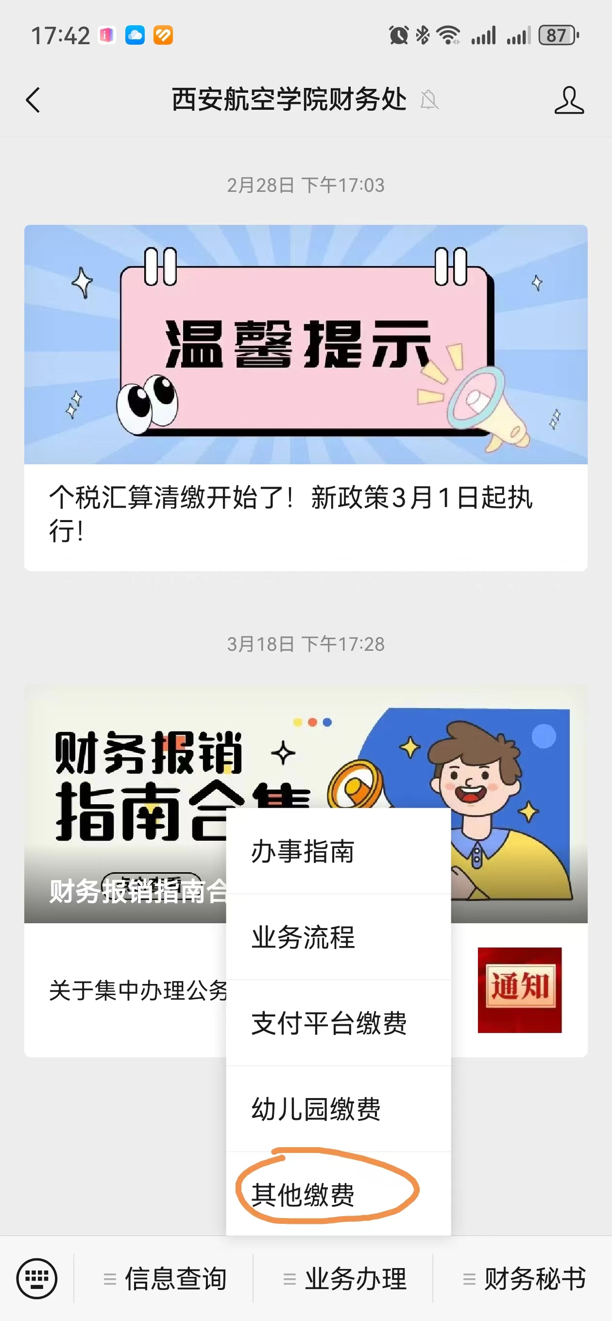 关注后点击“业务办理”、“其他缴费”,进入金沙城js93线路检测中心“校园统一支付平台”,输入账号、密码进行登录。
