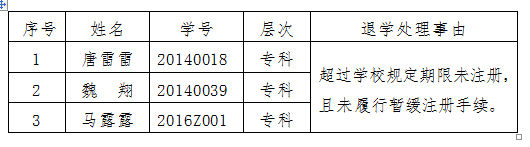 根据金沙城js93线路检测中心《关于成人高等教育员工学籍管理规定(修订)》第九条、三十一条相关规定,经公司研究决定,给予唐雷雷等3名员工退学处理。具体名单及处理事由如下:
